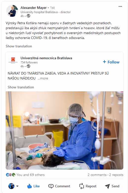Na splnomocnenca vlády, ktorý verí v chemtrails, reagovala aj Univerzitná nemocnica Bratislava, ako aj jej riaditeľ Alexander Mayer osobne.