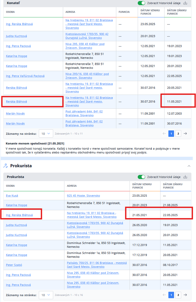 Navyše Bláhová rozpore s duchom zákona taktiež veselo pokračovala v podnikateľskej činnosti. Síce nie však ako konateľka, ale ako prokuristka svojich spoločnostiach AD SK, s.r.o. a BMB Partners s.r.o.