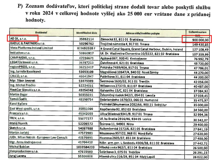Ako sa zdá, ak niekto plní politické noty, má to svoje výhody. Firma AD SK, s.r.o. sa stala minulý rok, ergo v roku 2024 najväčším dodávateľom tovarov a služieb. Firma Renáty Bláhovej zinkasovala od OĽaNO 900 000 €.