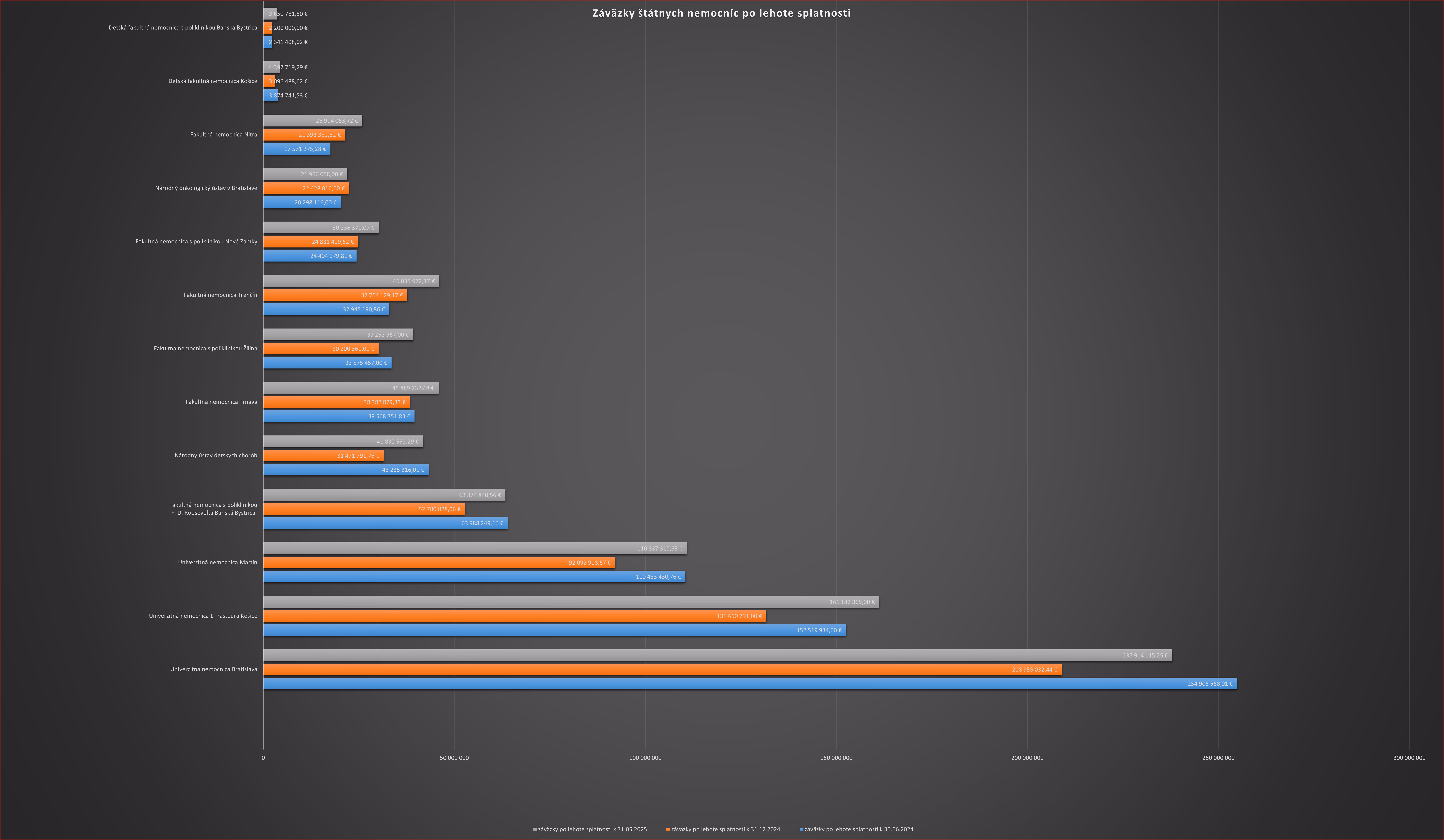 K 30. 06. 2024, ergo na konci Q2 2024 činili záväzky po lehote splatnosti sumu blízku 800 miliónom €. Tento dlh sa však v priebehu roka podarilo skresať o 13% a na konci roka 2024 dosahoval celkový dlh „len“ necelých 700 miliónov €. Tu mimoriadne relatívne dobré správy končia. Po poklese dlhu sa totiž štátne nemocnice opätovne zadlžujú a len za prvých päť mesiacov roku 2025 dokázali vyrobiť nové dlhy kumulatívne za 135,3 milióna €.