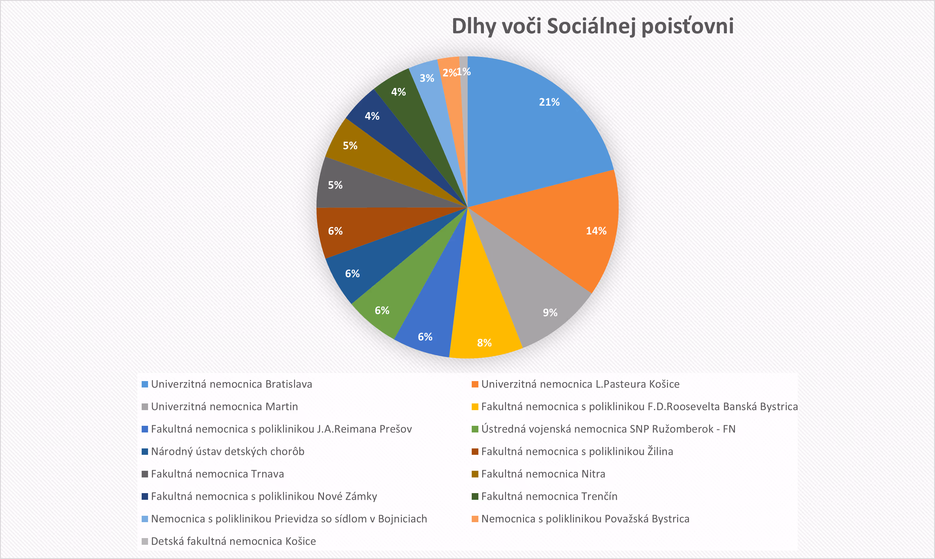 Štátne nemocnice sú jednoznačne s obrovským náskokom najväčšími dlžníkmi voči Sociálnej poisťovni. Aktuálny dlh všetkých štátnych nemocníc (zriaďovaných ministerstvom zdravotníctva, ministerstvom obrany a Trenčianskym samosprávnym krajom) prevyšuje 612 miliónov €.