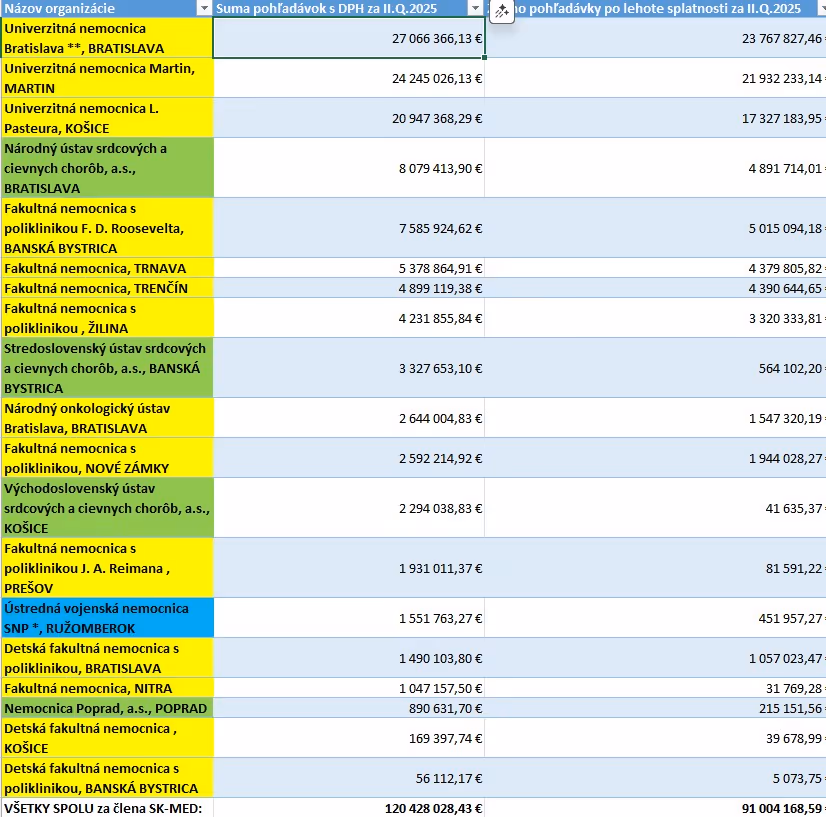 Nemocnice, ktorých zriaďovateľom je ministerstvo zdravotníctva, dlžia firmám združeným v SK+MED 104,2 milióna € (84,84 milióna € po lehote splatnosti). A Ústredná vojenská nemocnica SNP, Ružomberok má aktuálne sekeru 1,55 milióna € (451 000 € po lehote splatnosti).
