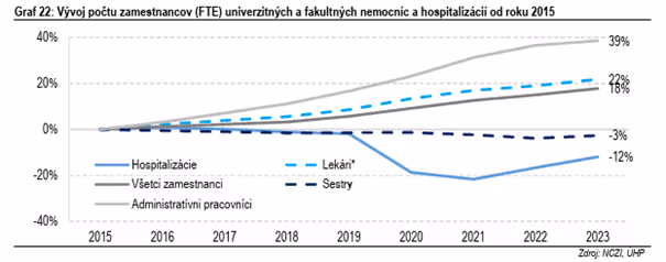 Ak by slovenskí pacienti za to masívne zvýšenie platov dostali dostupnejšiu a kvalitnejšiu starostlivosť, tak by to boli dobre „investované“ peniaze. Ale nedostanú. Smutnú realitu najlepšie vystihuje nasledovný graf. Ten na jednej strane hovorí o spokojnejších zamestnancoch v nemocniciach (dostali vyššie platy a ich počet narástol celkovo o 18%), no zároveň jasne ukazuje zhoršenú dostupnosť zdravotnej starostlivosti v slovenských štátnych nemocniciach (hospitalizácií je o 12 % menej) A 39 percentný nárast administratívnych pracovníkov je len (konsolidačnou) čerešničkou na torte .