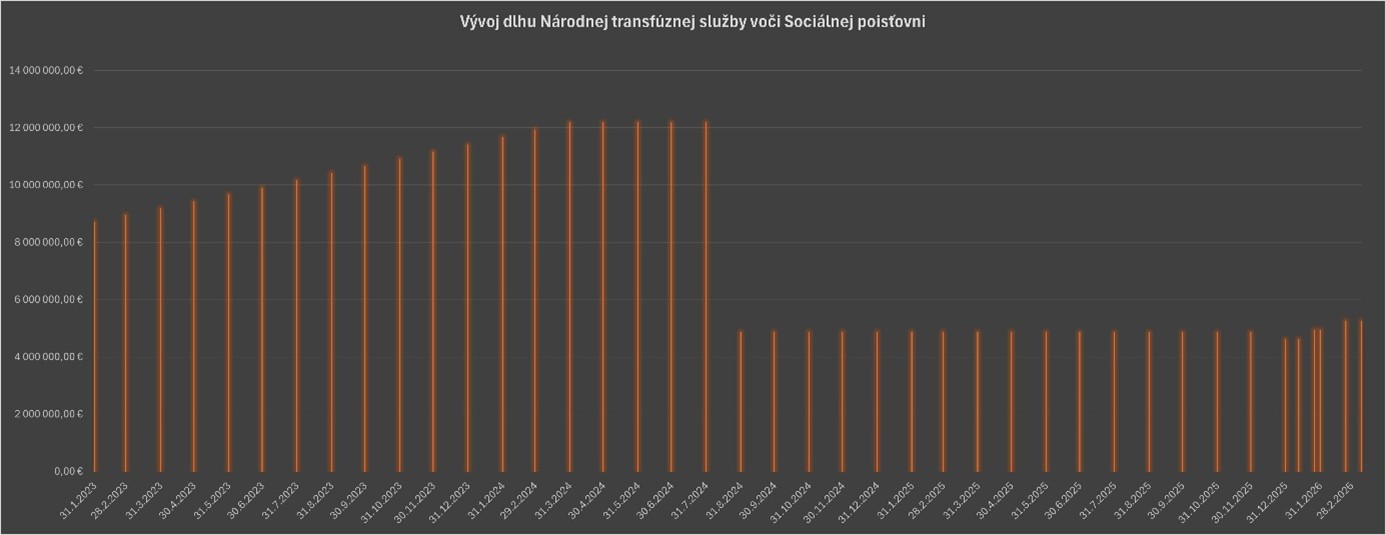 Ako sme spomenuli vyššie, aktuálny dlh je 5 241 902,32 eur a len od začiatku roka stúpol o 637-tisíc eur, čo predstavuje značný nárast v priebehu niekoľkých mesiacov. Dlh Národnej transfúznej služby bol pritom pomerne stabilný od 31. 8. 2024 až do 31. 1. 2026, kedy sa pohyboval v rozmedzí od 4 856 838,71 eur do 4 932 818,16 eur.